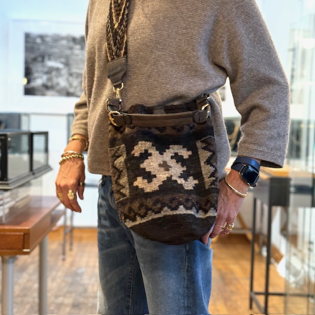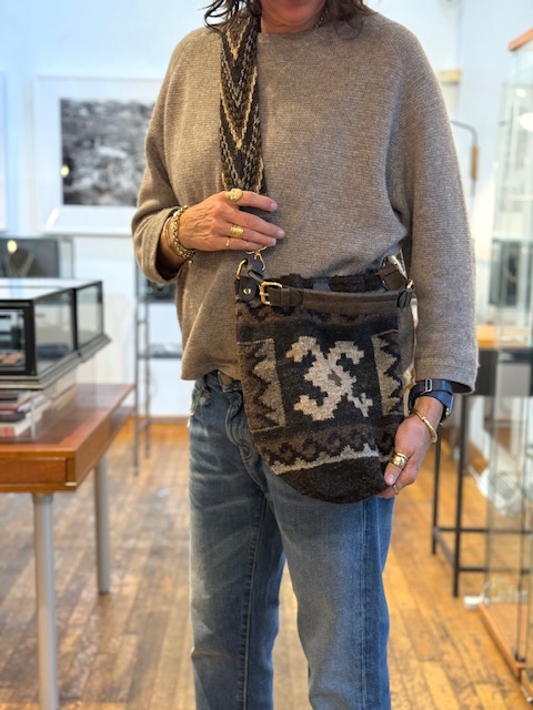 Handwoven 100% virgin wool bucket bag with magnetic snap clasp and 2-strap options: adjustable hand/shoulder version in chocolate brown leather AND wide, 36" pattern-woven crossbody strap. 6.5" round base x 10.5" tall.