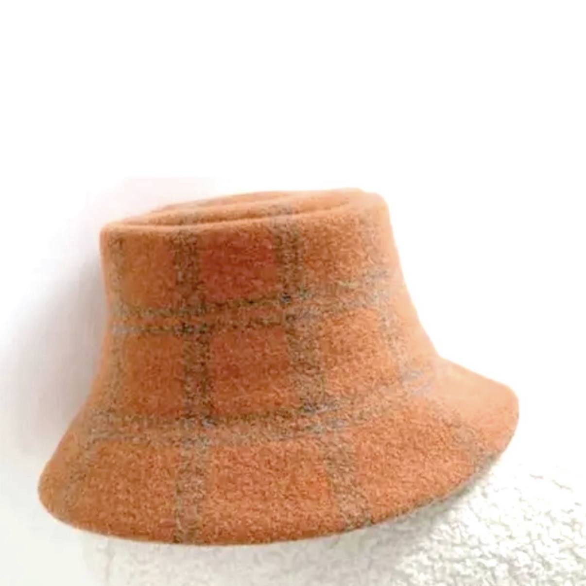 100% Australian wool plaid bucket hat, 2" brim. Size-adjustable velcro inner strap.