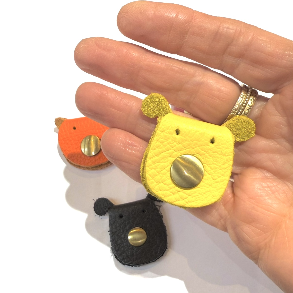 Li'l leather bear cord keepers with metal snap closure. Assorted colors, please inquire color availability. A cool gift, right??!