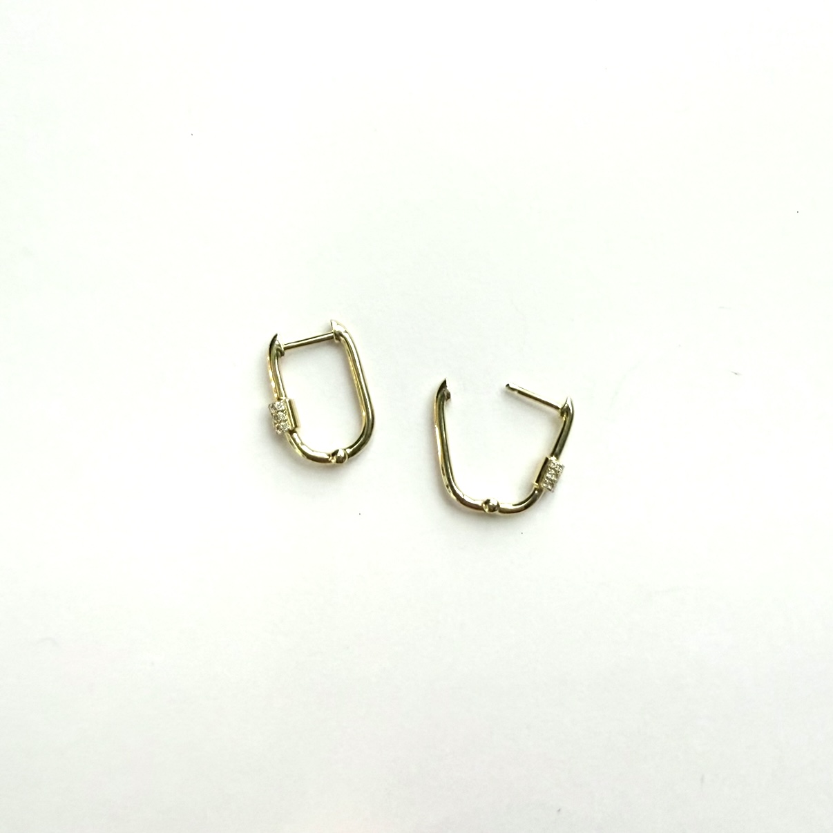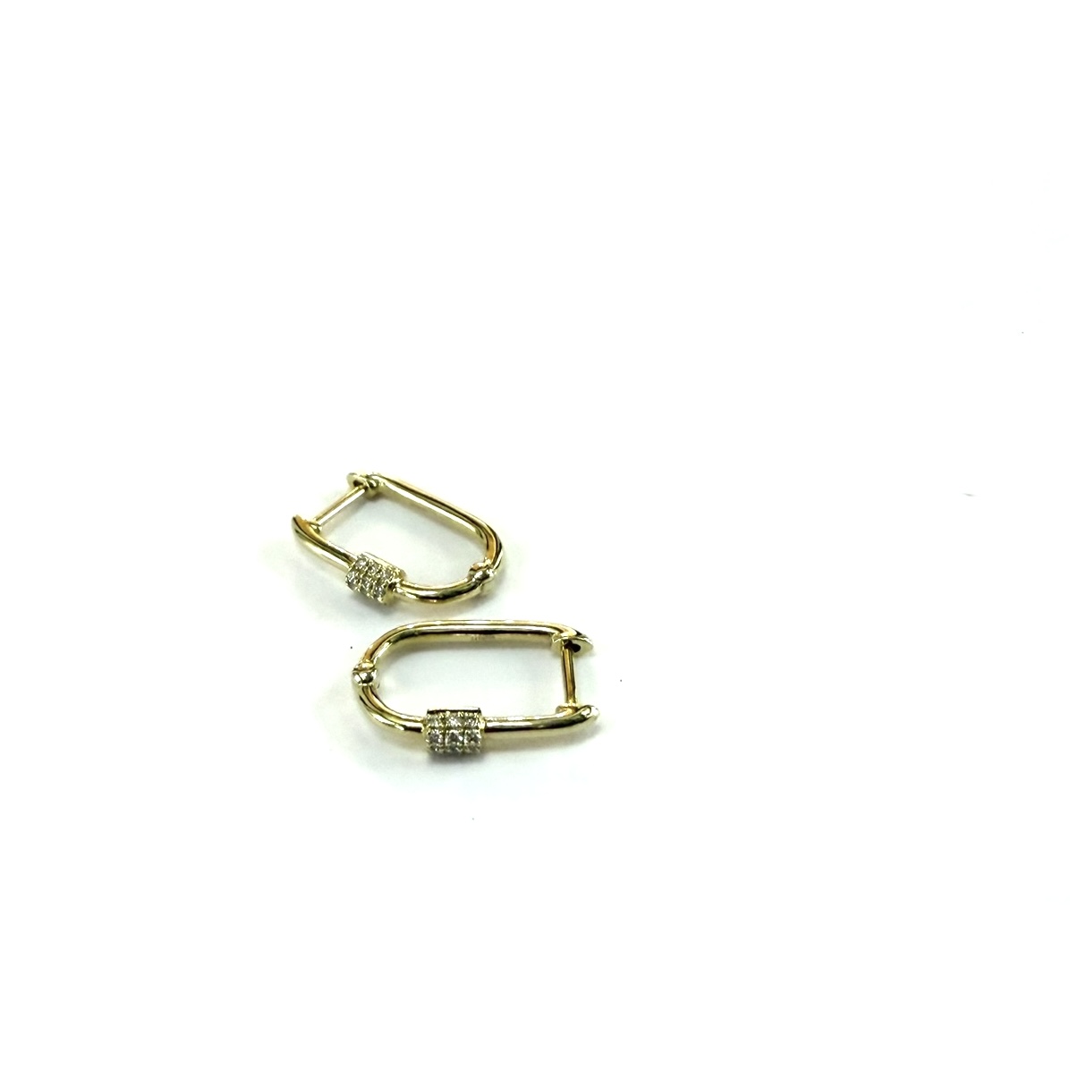 14k yellow gold huggie earrings with feature pave diamond barrel, .5" drop length.