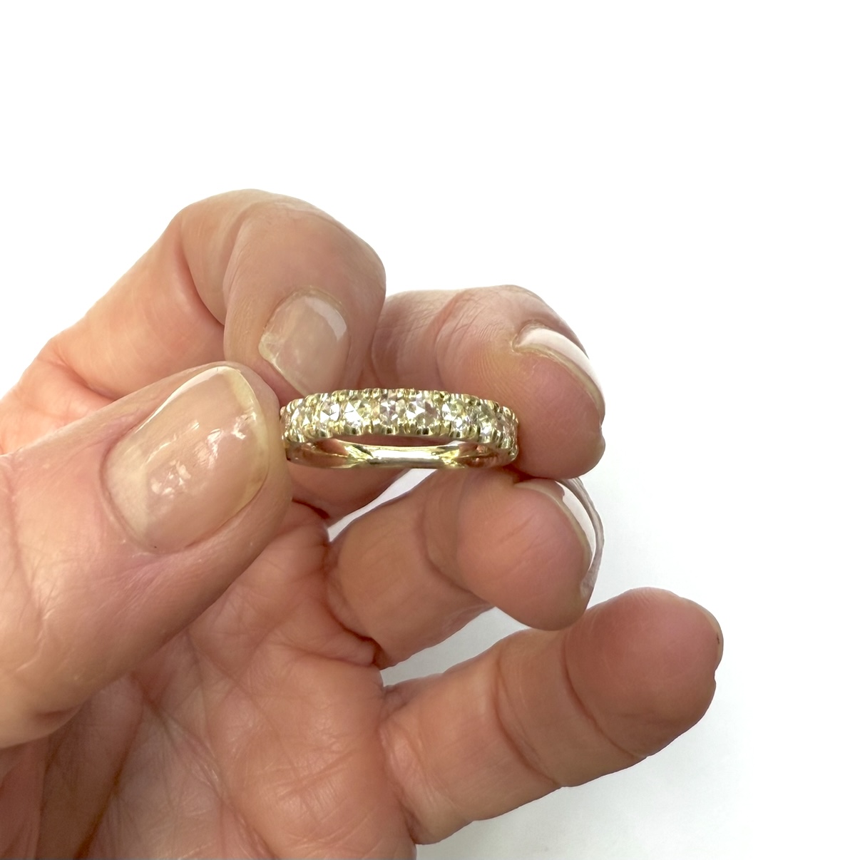 This stunning Euro band features rose-cut, white diamonds pave-set in 14k satin finish yellow gold. Hand made in Los Angeles.