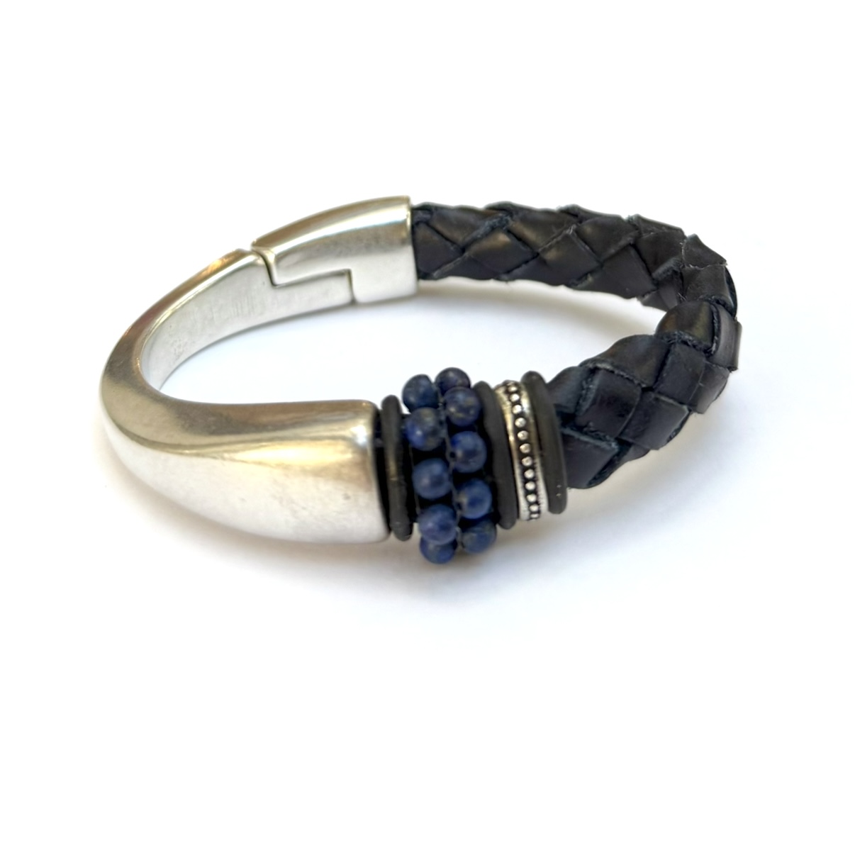 Hand-stitched matte lapis beads on a silver plated, distressed deep blue, braided leather cuff. Easy magnetic closure.
