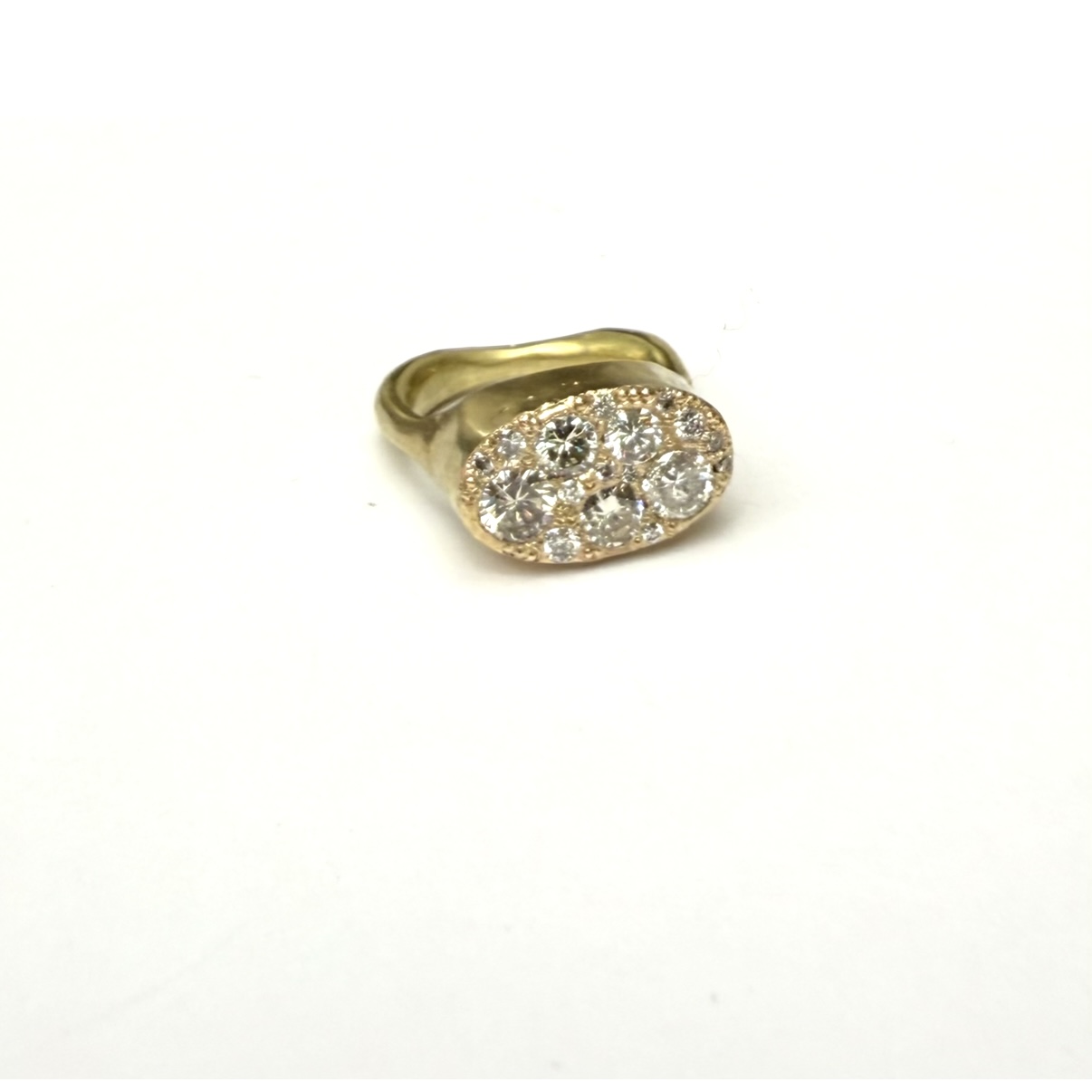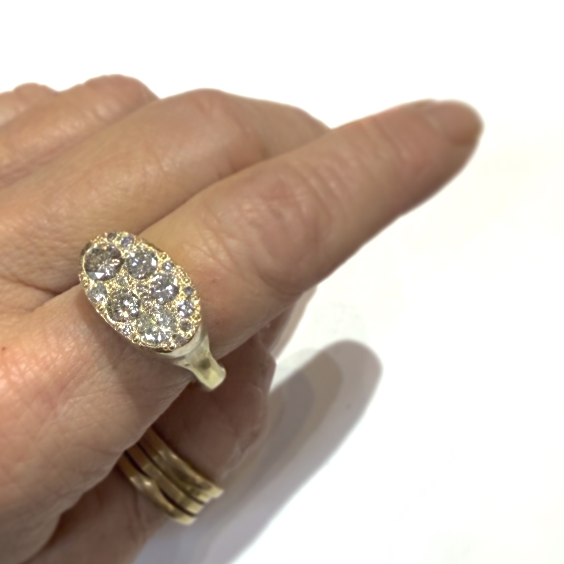 A gorgeous cluster of white diamonds - served to your hand on a 'platter' ..of solid 14k yellow gold, that is. Fabulously hand made and one of a kind!
