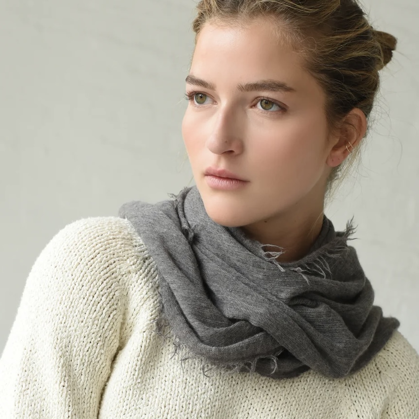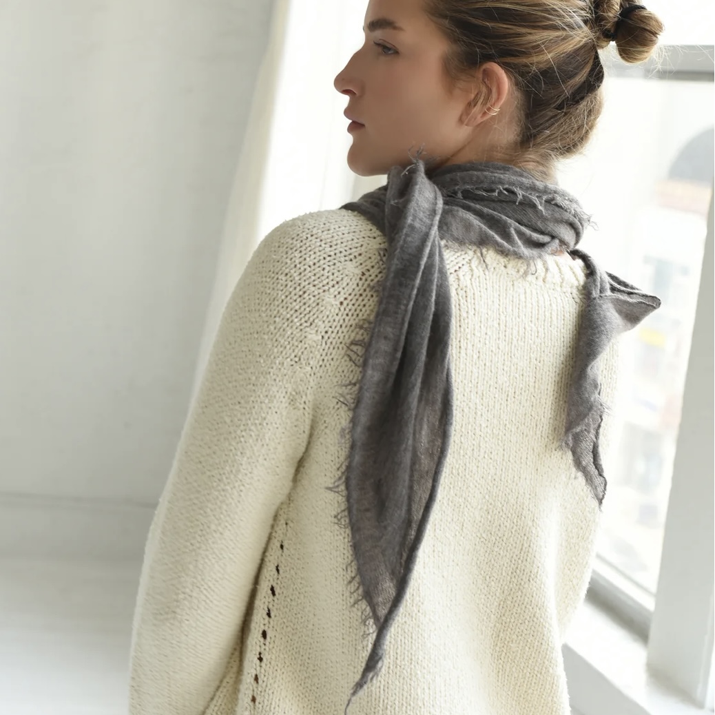 100% lightweight cashmere 'mini' scarf with fringed edges in heather grey. Elongated diamond shape, tapered ends. 18 x 62"
