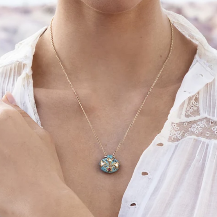 A gorgeous pebble-shaped chrysocolla pendant inlaid with finely chased floral motif in 18k gold plated sterling silver. Irregular diamonds and a single ruby beautifully enhance the design of the pendant, 5/8" drop length.