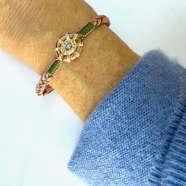 Macramé bracelet made from silk yarns in dominant shades of khaki and pink. Focal 18k gold plated sterling silver sun motif, set with a Polki diamond and mini irregular diamonds. 6 - 7" in length.