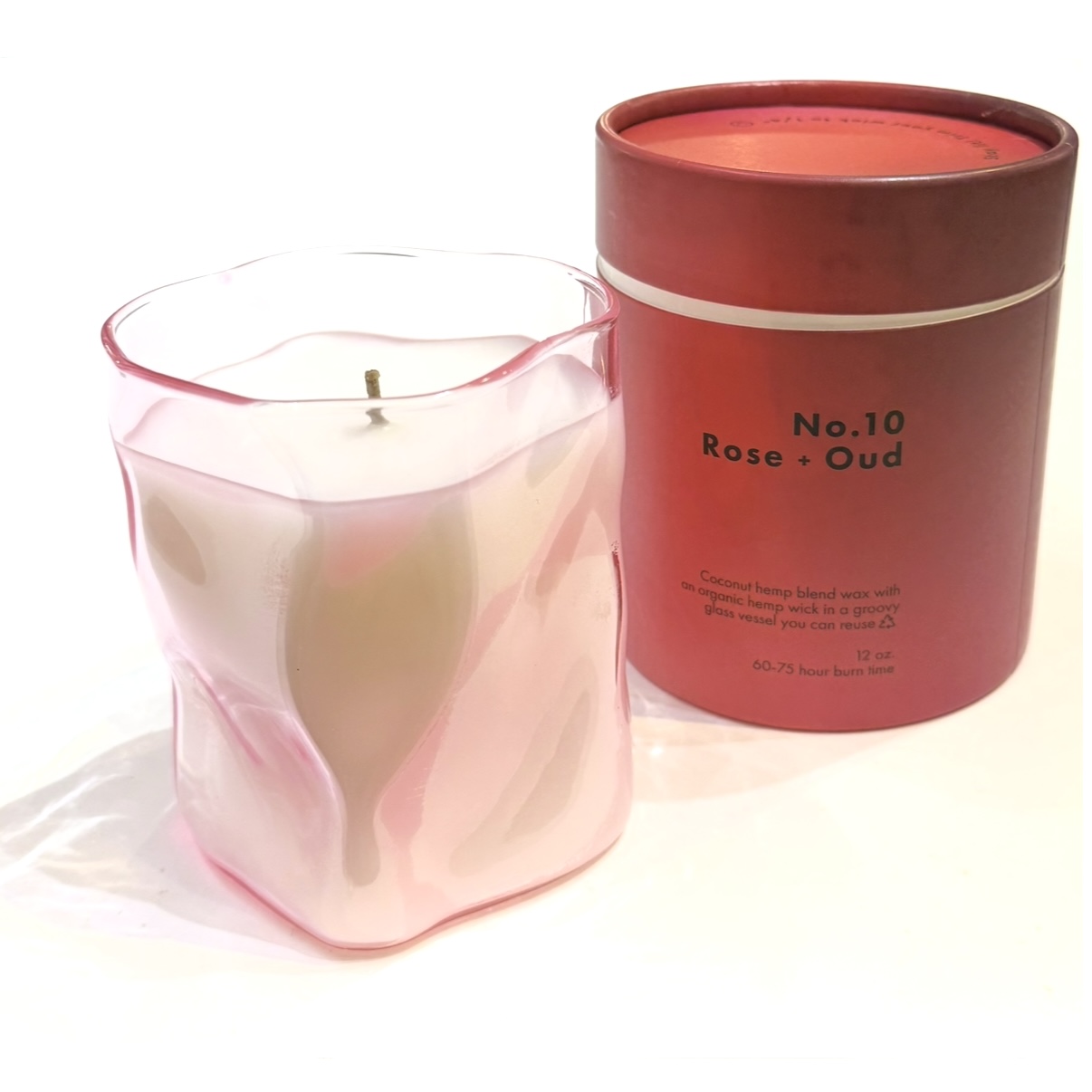 No.10 Rose + Oud candle - it's warm, floral, woodsy, sultry, sensual, seductive, and musky. Medium to strong scent intensity. Made with hemp coconut soy blend wax and burns with a hemp wick all in a groovy CLEAR glass vessel meant to be reused - each vessel is unique in shape! This 12 Oz. vessel will burn for 60-75 hours under optimal burning conditions.