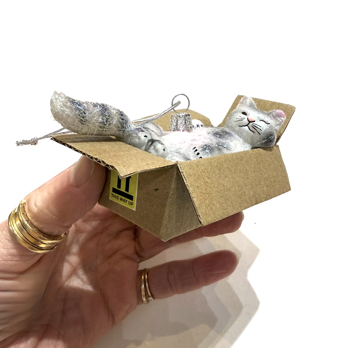 Corrugated box enclosed glass cat ornament. What a fun shipment! 4.5"L x 2"H