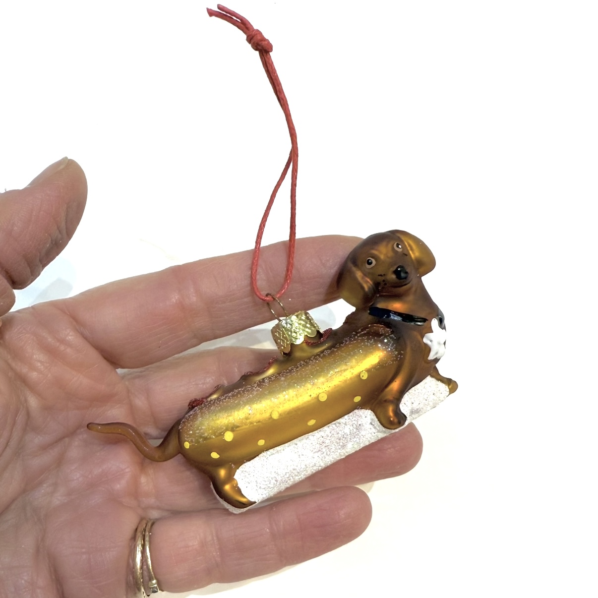 Glass wiener hotdog ornament, 3.5" long x 1.75" tall.