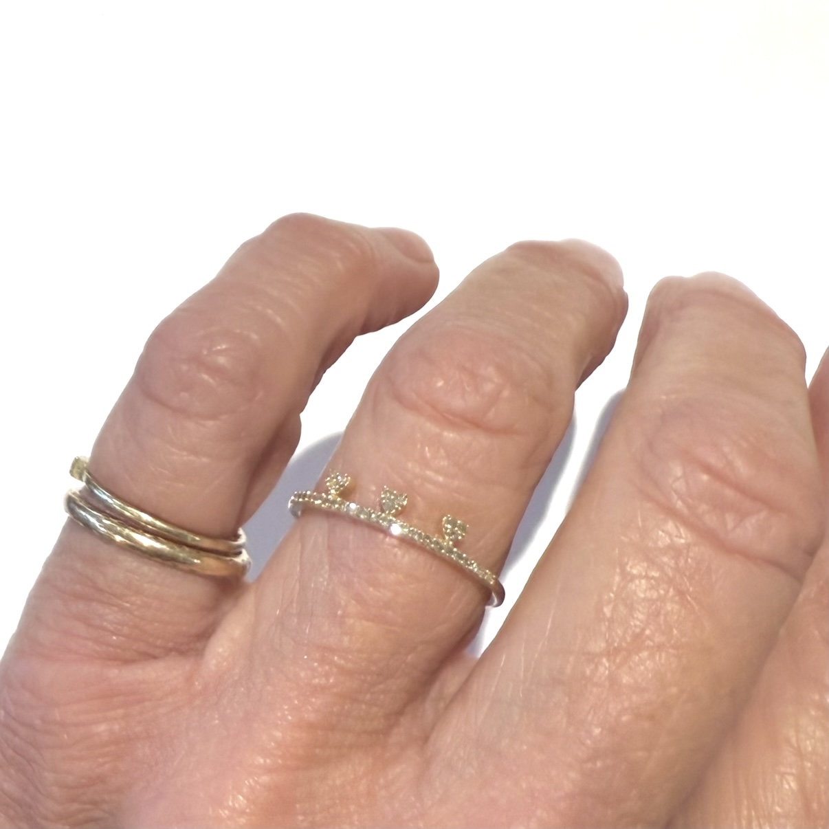 This lovely10k yellow gold end-stacking ring has half eternity pave-set diamonds and 3, 3-diamond drops. Imagine it book-ending YOUR stack!