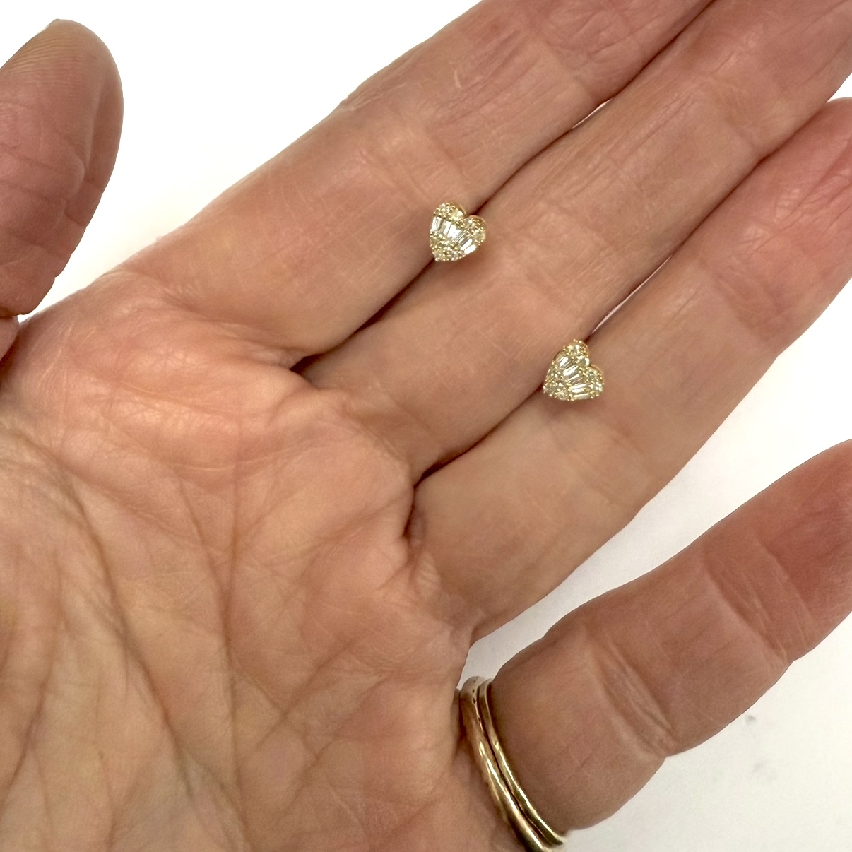 Baguette and round diamonds set in 14k yellow gold, post backing.