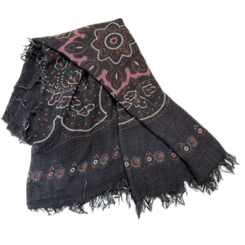 Cashmere and silk (70/30) blend scarf in a coo back floral mandala print. This unique blend offers the warmth and softness of cashmere with a featherweight hand.