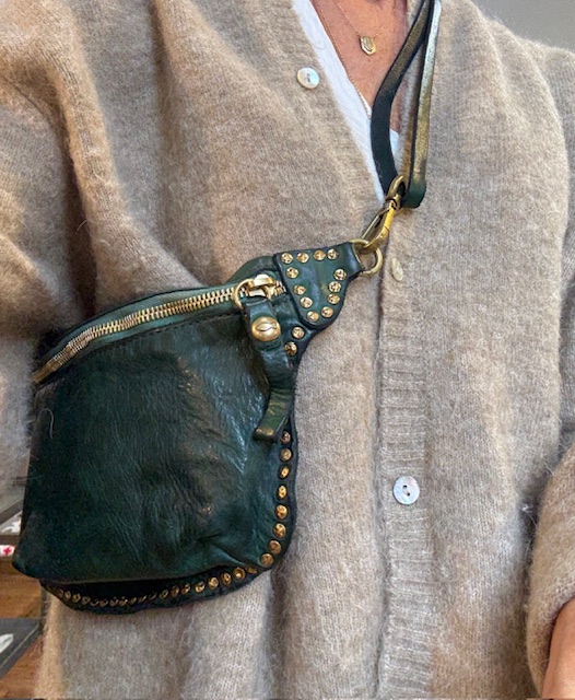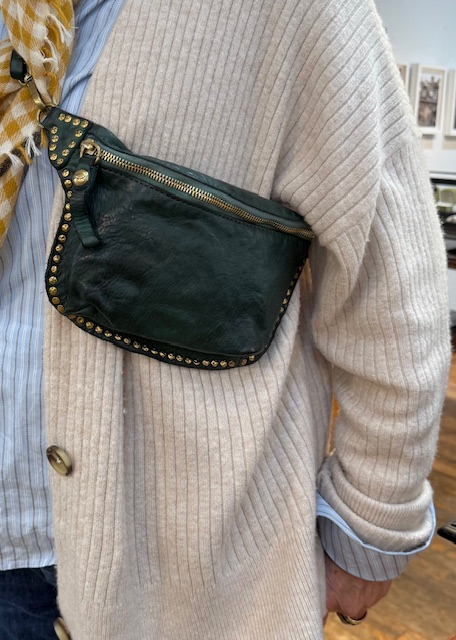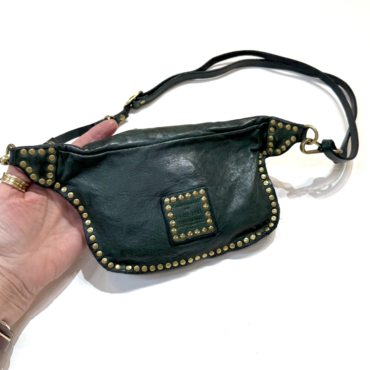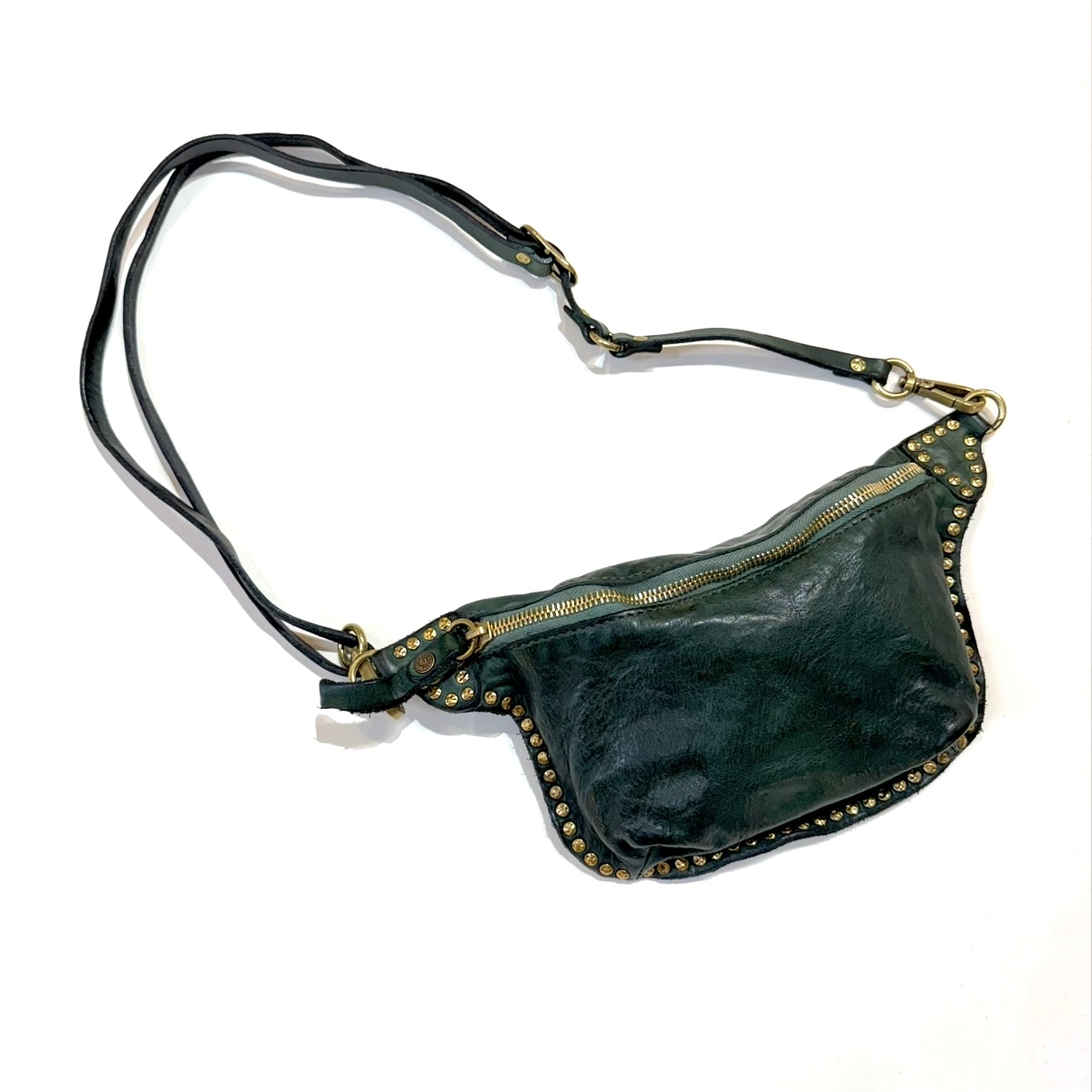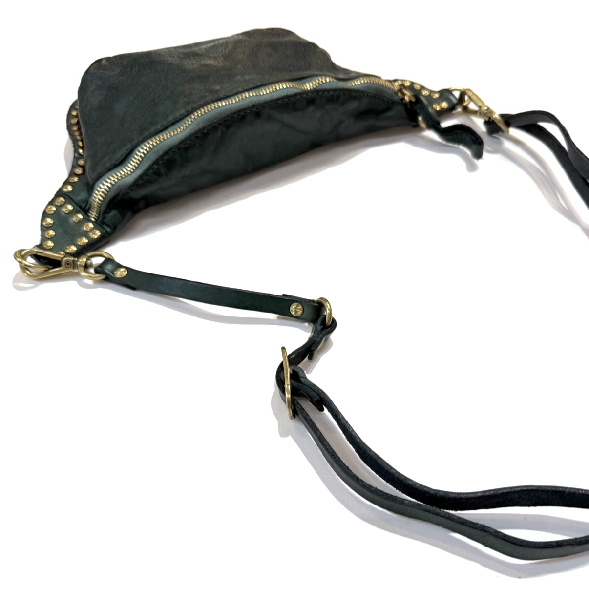 Studded leather crossbody bag in bottle green with main body zippered closure and brass hardware. 28-43" adjustable strap. Handmade in Italy.