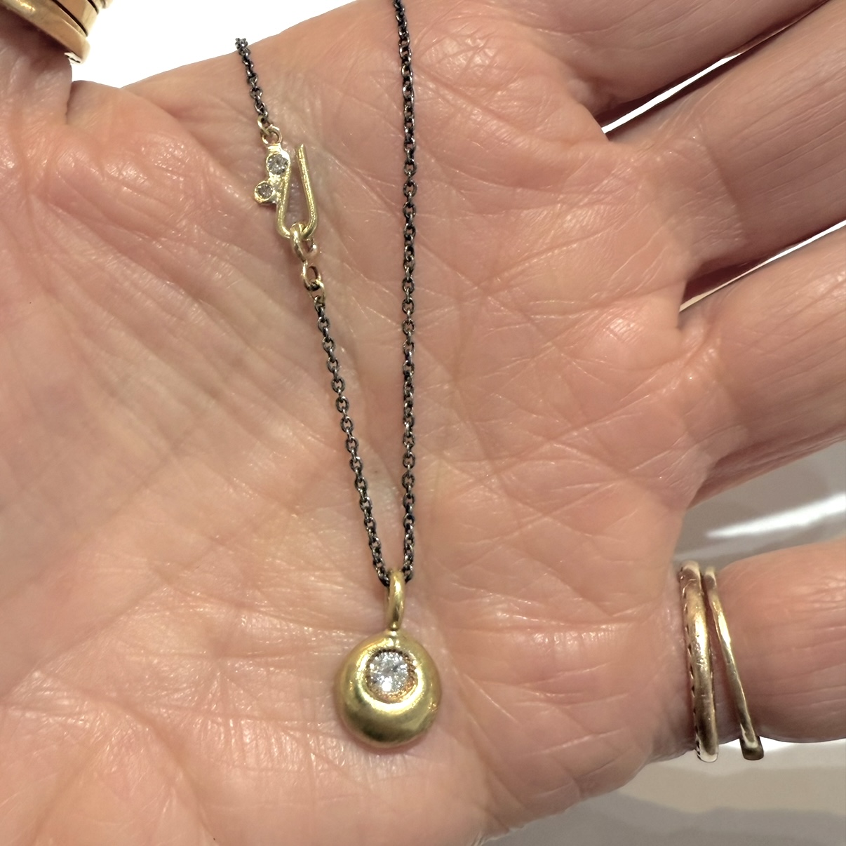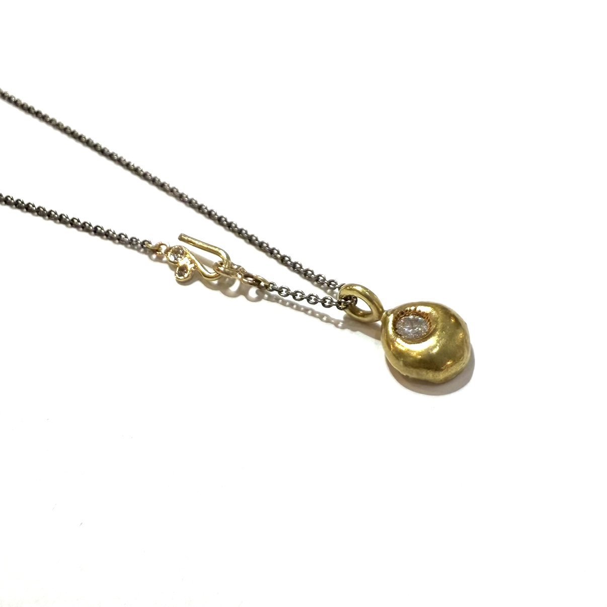 14/18k yellow gold bubble pendant with feature with diamond center. 18" chain of mixed oxidized sterling silver and 14k yellow gold. Handmade 2-diamond moveable hook closure - wear in to be seen or at the back of your neck. One of a kind.