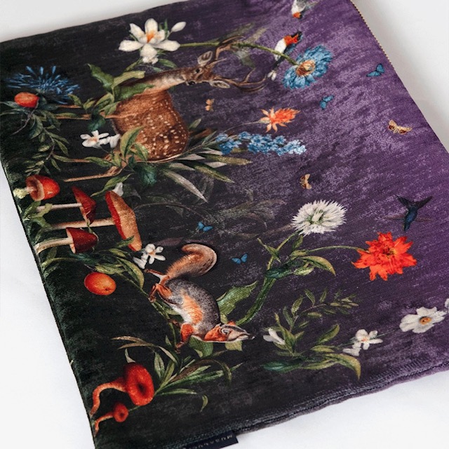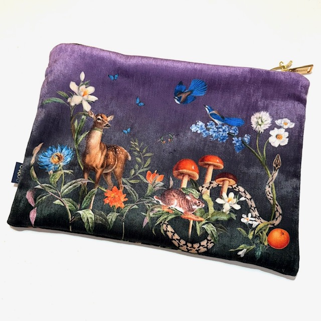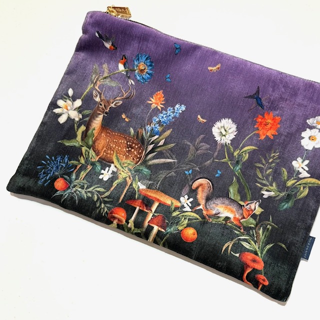 A sublime expression of luxury and distinction for any occasion, this bag is crafted from polyester with a velvet texture and printed by sublimation with a simple tone-on-tone hem detail. Measures 12.5 x 8.5". Gold tone zipper closure, silk satin poly 'star' interior. A work of art!